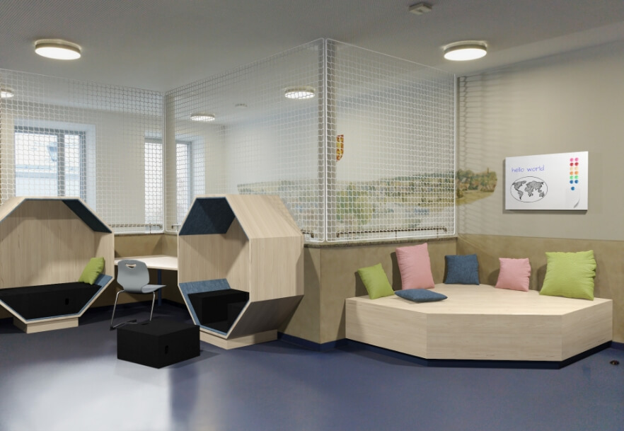 Von der Vorschule bis zum Gymnasium und darüber hinaus. Durch die wabenförmigen, flexibel angeordneten Module ergeben sich zahlreiche Nutzungsmöglichkeiten.